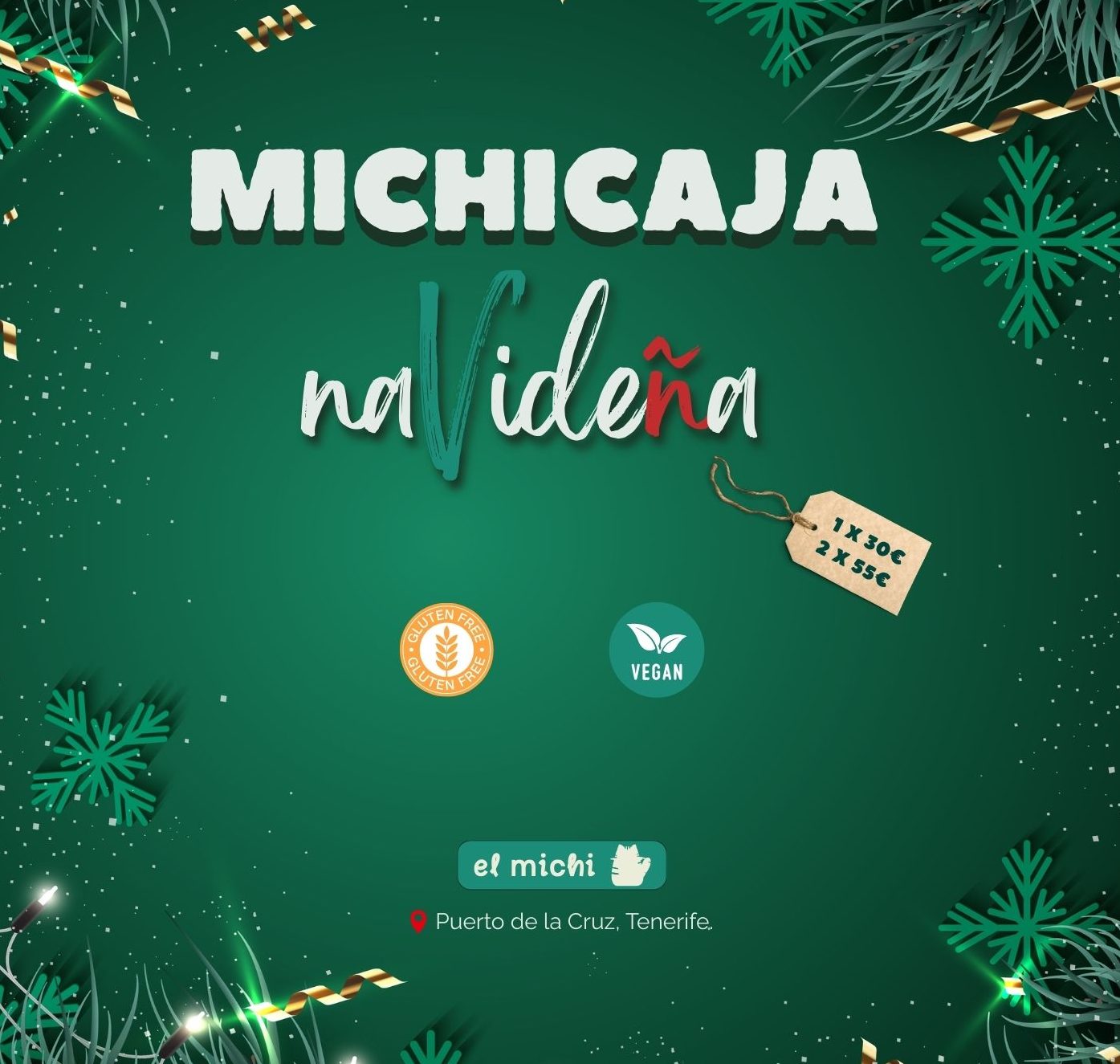 🎄 Esta Navidad, mesa rica, 100% vegana y sin gluten. Presentamos la #MichiCaja: entrantes, calientes y postres caseros. 1×30 € · 2×55 € — plazas limitadas. 📍 Retiro en Puerto de la Cruz 👉 Reserva AQUÍ t.ly/VHn2e